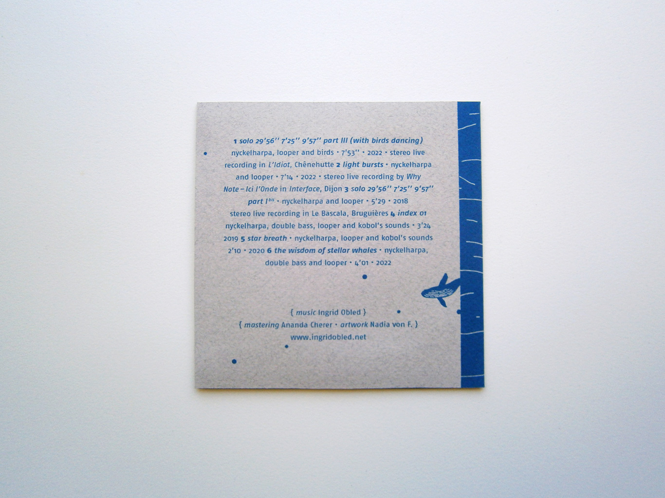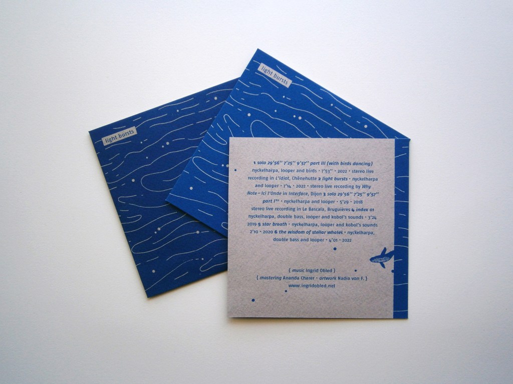 light bursts, released on the 15th December 2022, is the 2nd part of a trilogy. The 1st solo album 29’56’ ‘ 7’25’ ‘ 9’57’ ‘ designated both the coordinates of an imaginary place and the time of the 3 tracks. With this 2nd album, we take off from this imaginary place in the direction of the world of stellar whales. Light bursts is a sound path, a march towards the 3rd album which will be released in 2023, a 3rd album which will dive us totally into the world of the stellar whales.