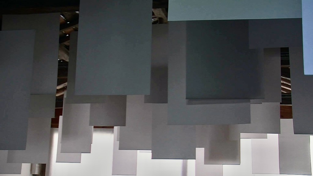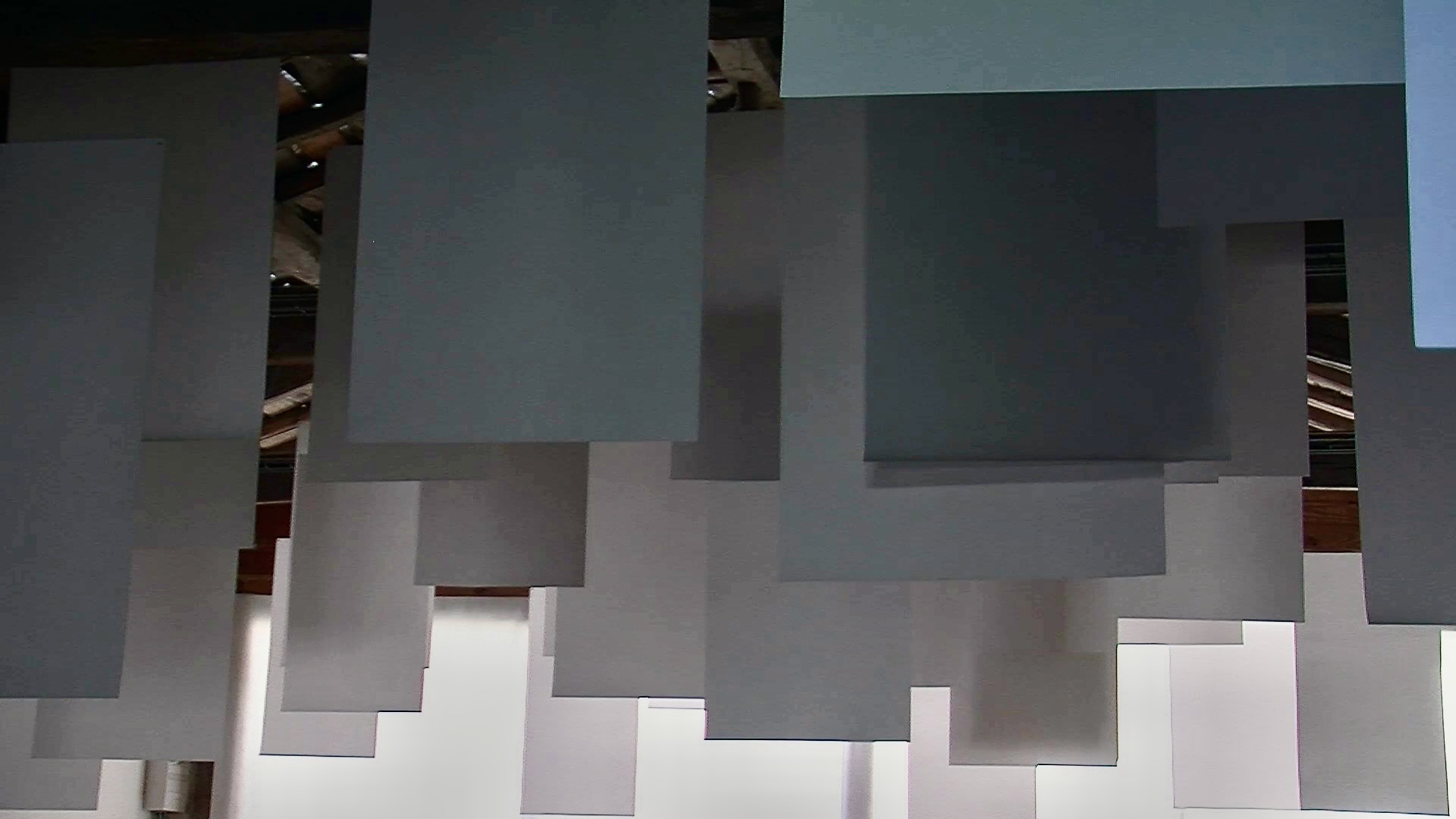 Four flat paper speakers, technological innovations conceived and patented for the installation by Gilles Douziech, are concealed throughout the space.